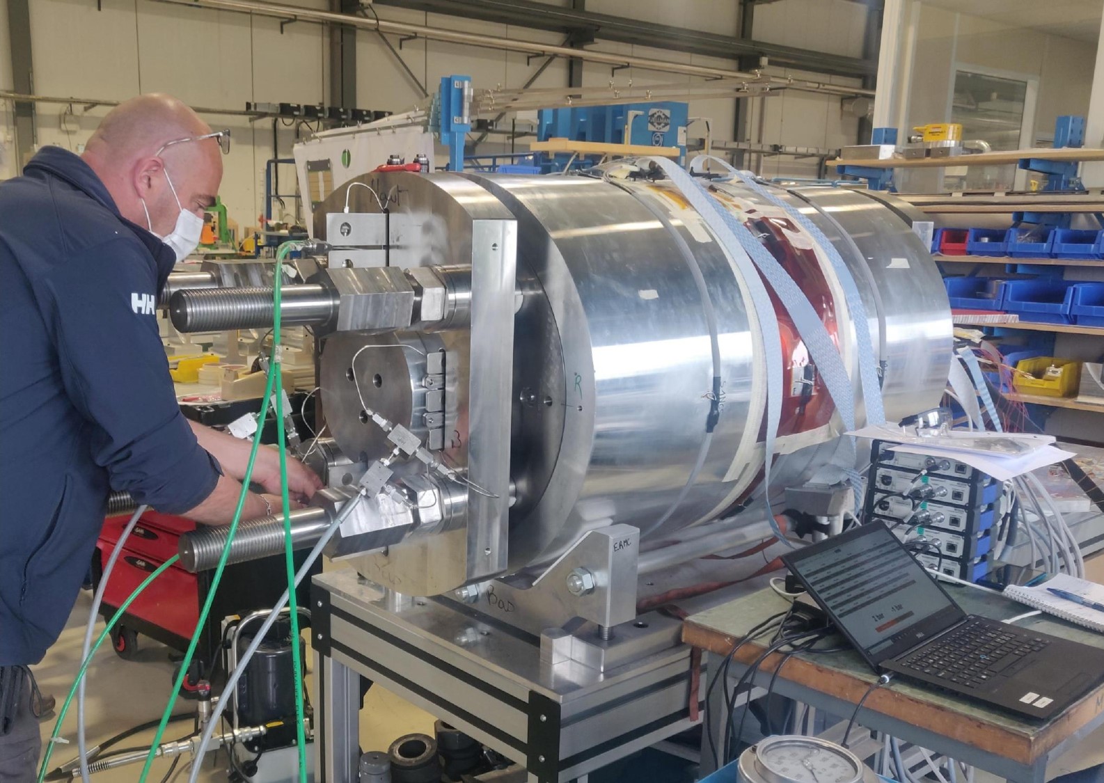 RMM1 flat-racetrack magnet during loading operation. The magnet achieved 16.4 T in the central cavity. Courtesy of CERN MSC.