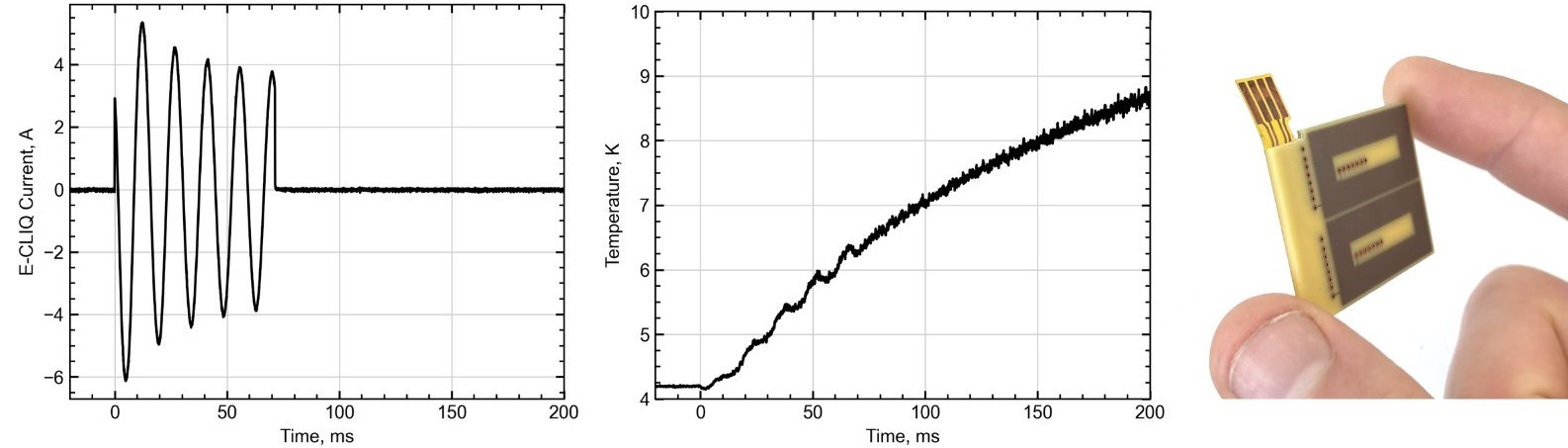 E-CLIQ device, designed for implementation in a SMC11T coil (left), simulated current oscillation in the E-CLIQ unit (middle), and simulated temperature rise in the coil (right). Courtesy CERN MPE group.
